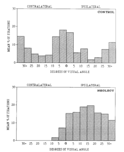 視覚的半側空間無視を持つ患者を対象に完全な暗闇の中で光を探索する課題を行い、その時の視線の動きについて計測を行った。視線の固定点は中央線より右側に偏っていた。対照群である視野欠損患者は両側を同じように探索した。この結果から半側空間無視患者は左方向の感覚情報処理過程とは関係なく右方向への偏りがあることが示された。この結果は半側空間無視患者における注意が半球性に制御されていることと対側空間の表象が障害されているという仮説に関連するものである。