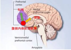また前頭前野も様々な情報が取りまとめられる領域ではあるのですが、その中でも右脳と左脳がくっつく脳の内側面にある腹側内側前頭前野は、情動に関わる情報と理知的な情報を取りまとめるような場所に位置しています。