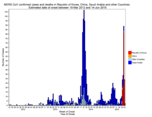 この感染症モデルに再感染の要素を入れると以下のMERS(中東呼吸器症候群)の感染者グラフのように周期性を示すコブ型のグラフになることが知られていますが、