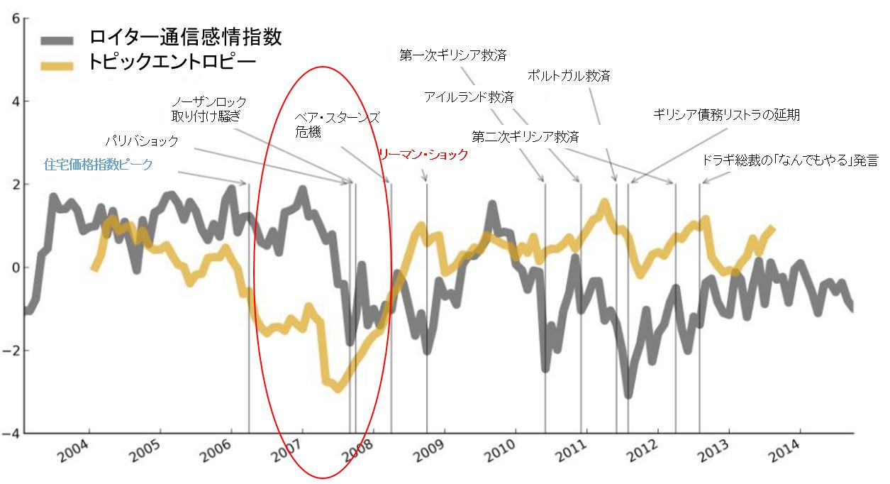 ある研究ではロイター通信を始めとする英語圏の記事の中で、悲観的な言葉と楽観的な言葉の割合と言葉のエントロピーについて調査し、経済状態との関連について調べています。