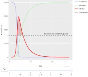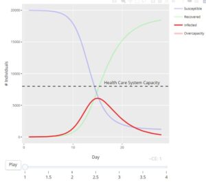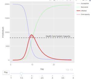 で構成され、接触頻度や潜伏期間のパラメータを変えることで、感染ピークを推定できるものです(以下はCovid-19を例に取ったグラフ、直接接触率が下がるにつれて感染ピークが変化することを示しています)。