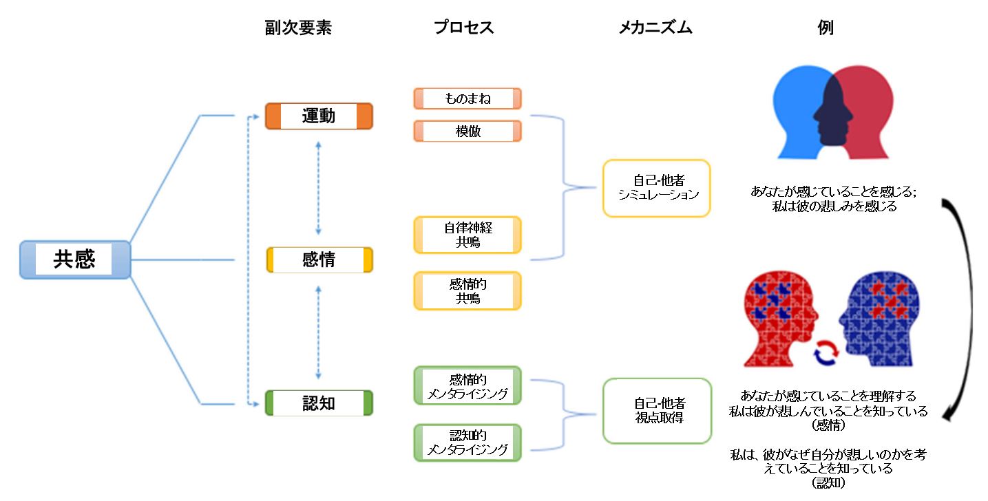 | 感情的共感 | 他者の感情状態に即座に感知し、心理的または感情的に共鳴する能力 | - 心拍数、心拍変動、呼吸などの生理学的な変化や、自己申告の感情変化を測定 |