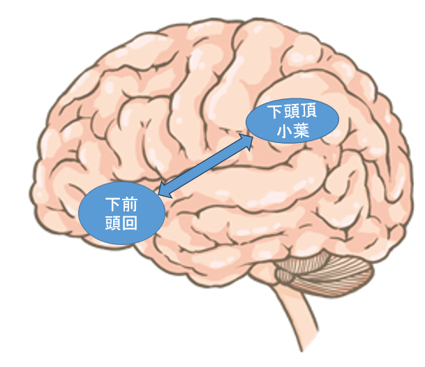 このネットワークの中心となる領域は2つあります。ひとつは「左下前頭回(より広義には左腹側運動前野)」、もうひとつは「下頭頂小葉」と呼ばれる部分です。