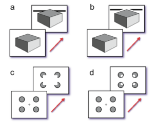 また同様に立方体の背後の棒が切れていないaの図では左側の認知が良好であるのに対し、bの図では認知しづらくなることが述べられています。