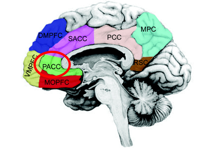 そしでデフォルトモードネットワークの中でも前帯状皮質の前方領域(下図PACC)が特にアイデンティティ認識の中心であると考えられている1)。
