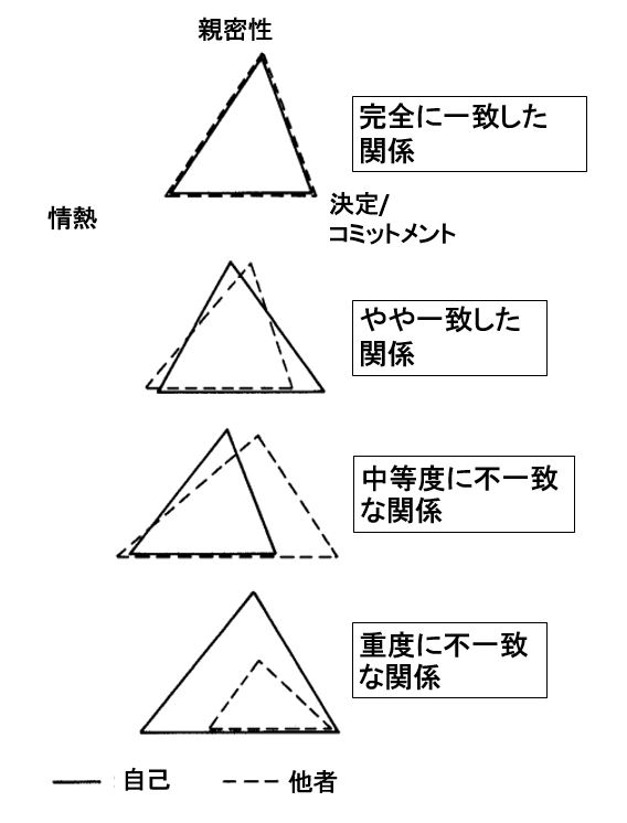 愛は、1つの三角形だけでなく、現実の三角形と理想の三角形、自己の三角形と他者の三角形、自己認知の三角形と他者認知の三角形など、多くの三角形によって表現されます。これらの三角形間の一致度が高いほど、関係満足度は高くなる傾向があります。