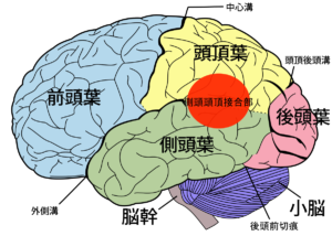 この腹側注意ネットワークの中核領域の一つに右の側頭頭頂接合部があります(図の赤色部分;この図は左半球ではありますが)。