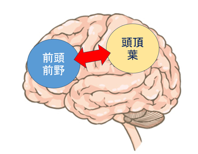 ではこれらの注意はどのような仕組みで動いているのでしょうか。私達の脳の中にある神経細胞は互いに繋がり合っていて、多くのネットワークを作っています。そのネットワークの中には、運動に関わるネットワークもあれば、聴覚に関わるネットワークもありますが、注意に関わるネットワークもあります。この注意に関わるネットワークは、主に前頭前野と頭頂葉を結ぶような形でできています。