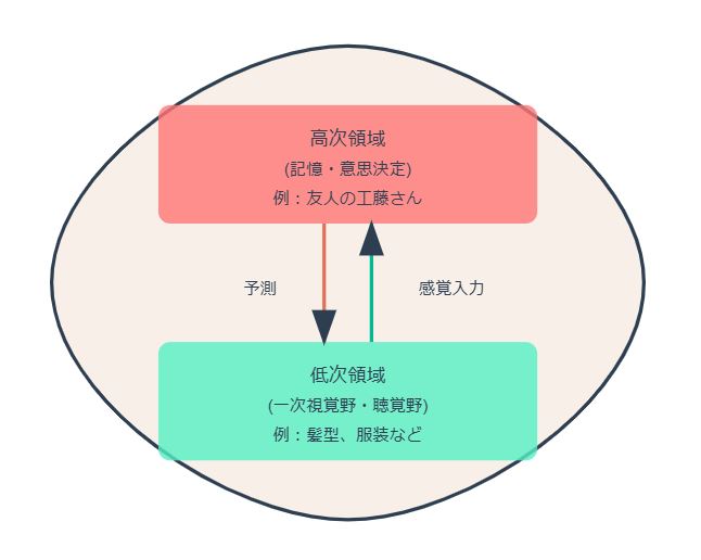 たとえば、あなたの脳の上位領域が「今、前方にいるのはいつもの友人だろう」と予測しているとします。すると、下位の視覚領域は、その人の体格や髪型、服装の色など、より具体的な情報を一つひとつチェックします。もしそれらが友人の特徴と一致すれば、上位の予測と下位の感覚情報にはほとんどズレがなく、脳は「ああ、やっぱりあの友人だ」と納得するのです。