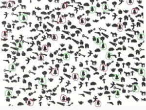 ・ベルテスト(A4用紙に記載された35個のベルを280個の惑わし刺激と区別して見つけ出し、鉛筆で消去する課題)