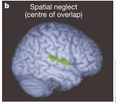 一般に半側空間無視に影響する領域として右の下頭頂小葉、右下前頭回、側頭-頭頂-後頭接合部が挙げられているのですが、