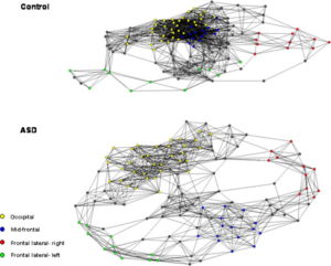 また自閉症スペクトラム障害では小さなネットワークのカタマリ具合を示す指標であるクラスタ係数が小さく、またパス長が大きくなっており、健常者のスモールワールドネットワークとは対象的にいわば「ビッグワールドネットワーク」のような構造になっていることが示されています。(上が健常者、下が自閉症スペクトラム障害)