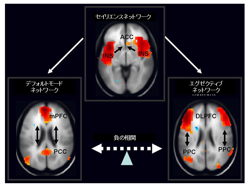 エグゼクティブネットワークは実行機能に関連している。これを構成するのは、知性に関わる前頭前野と感覚に関わる頭頂葉である。それに対して、デフォルトモードネットワークはぼんやりとした思考や創造性に関連する。自己意識に関わる前頭前野と頭頂葉の内側の部分が繋がってできている。さらにセイリエンスネットワークはこれらのネットワークの切り替えに関わるもので、帯状皮質や島皮質といった注意や気付きに関連した領域で構成される。ちなみにデフォルトモードネットワークとエグゼクティブネットワークは、シーソーのように、片方の活動が強くなれば、もう片方が弱くなる形で活動している。集中しながらぼんやりすることは難しいが、それはこの2つのネットワーク間でシーソーのような関係があるためである。