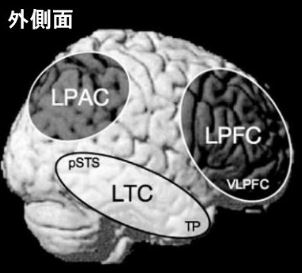 社会で生きていくためには相手の心が分かる必要がありますが、この分かり方には2つあります。一つは心の理論と呼ばれるもので、相手の心をシャーロック・ホームズのようにクールに読み解くものになります。この心の理論に関わる脳領域としては外側側頭皮質(LTC)と呼ばれる領域と背内側前頭前野(DMPFC)と呼ばれる領域があります(部位については上図を参照)。外側頭頂皮質はパッと見た時の視覚情報を取り込む働きがあり、背内側前頭前野はその情報を元に相手の心を類推する働きがあります。うつむき加減の友人を見て(外側頭頂皮質)、その理由を考える(背内側前頭前野)のように、相手の心を理解する仕組みがあります。