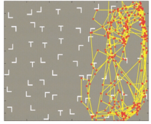 まず最初に行ったのは数ある資格刺激の中からTだけを探し出す課題なのですが、左半側空間無視患者らしく視線は過度に右側へ偏っています。
