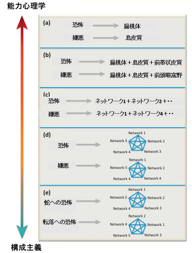 上記の論文では、様々な感情に対応する脳領域がある仮説が比較的妥当性が高いと論じられているのですが、近年の研究では、感情の仕組みはより複雑なのではないかと考えられています。脳科学の立場として、それぞれの機能(記憶、感情、判断)に関連する脳の働きがあるという局在論的な立場と、様々な機能は様々なシステムの組み合わせによって生じるという構成主義的な立場があります。近年の研究からは構成主義的な立場が現実の脳の働きを反映している井野ではないかと考えられています(LindquistとBarrett, 2012年)。これは料理で言えば、醤油や酒や塩、みりんによって様々な風味が生じるように、記憶や判断、感情などの心的活動も基本的な脳活動の組み合わせによって生じるのではないかと考える立場です。この立場に立てば、不安や嫌悪といった個々の感情も普遍的なネットワークの組み合わせとして表現される方が妥当ではないかと論じられています。