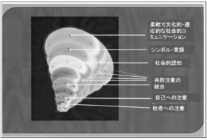 つまり社会的コミュニケーションは段階的・螺旋的に成長していくもので、この螺旋の始まりに他者と自己への気付き、共同注意があるということが述べられています。