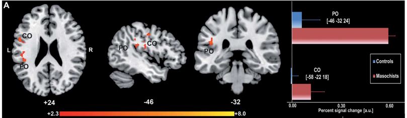 また脳活動の変化としては、マゾヒストはマゾヒスティックな画像を見ながら痛みを受けているときには、中心弁蓋部(CO)と頭頂弁蓋部(PO)の活動が高まったこと、また頭頂弁蓋部と情動的知覚領域(島皮質など)のつながり(機能的連結)が低下したことが示されています。