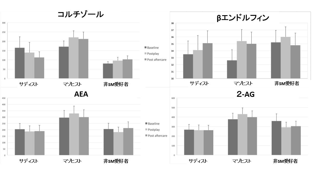 結果としてはマゾヒストはサディストや非SM愛好者と同様にSMプレイ後にストレスホルモン(コルチゾール)が増えるのですが、同時に脳内麻薬も増えることが示されています。