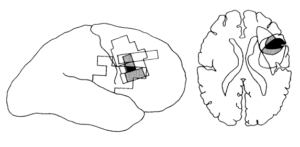 この5名に共通する損傷領域として下前頭回の一部であるブロードマン44野(左半球の言語領域であるブローカ野の右半球相同部位)が共通していること、