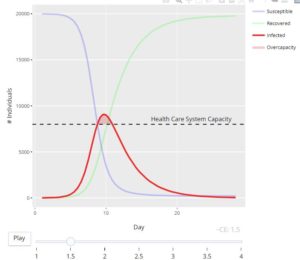 で構成され、接触頻度や潜伏期間のパラメータを変えることで、感染ピークを推定できるものです(以下はCovid-19を例に取ったグラフ、直接接触率が下がるにつれて感染ピークが変化することを示しています)。