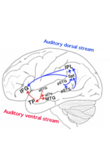 聴覚においてもこの背側経路と腹側経路に当たるものが存在し、背側経路(dorsal stream)は音の形、腹側経路(ventral stream)は音の意味の処理に当たると考えられています。