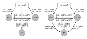 また覚醒段階が上がるに連れ、対象の認知に関わる領域である下側頭葉の活動が高まるのですが、この活動の高まりは前述の背外側前頭前野と頭頂葉の活動に仲介されていることが示されています。