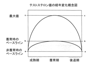 またこういった短期的な変化とは別に人生周期の中でもテストステロンの上がり下がりというものがあります。