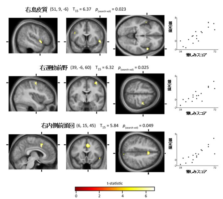 憎しみと関連を示す領域として、島皮質、運動前野、内側前頭回、被殻が示されました。
