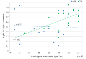 結果を述べると、定型発達の青少年においては、心を読み取る能力が高いほど右側頭ー頭頂間の関連性が強くなり、