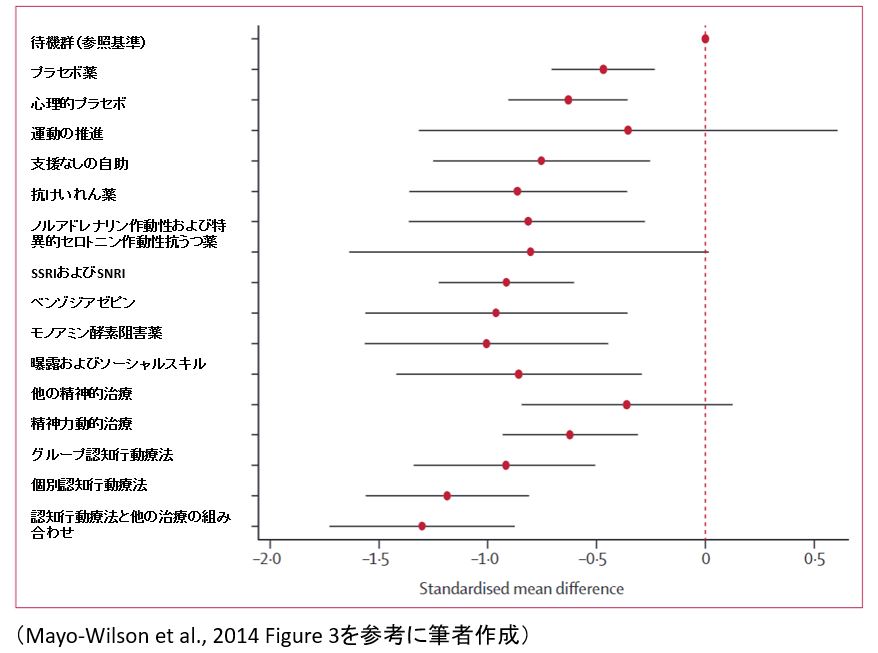 社交不安障害は経過が長い疾患であるが、ではその治療法にはどのようなものがあるのだろうか。ノースカロライナ大学チャペルヒル校のウィルソン准教授は社交不安障害の臨床介入研究データを取りまとめ、各種治療法の効果を示している。効果としては、認知行動療法が最も高く、ついで薬物療法、運動療法が続いている(Mayo-Wilson et al., 2014)。個人的には筋トレや走り込みを行った後、2時間位は調子が良かった思い出もある。認知行動療法はやったことはないが、日々の生活の中での小さな成功経験が何かしらの症状の改善に影響したことはあるのかもしれない。
