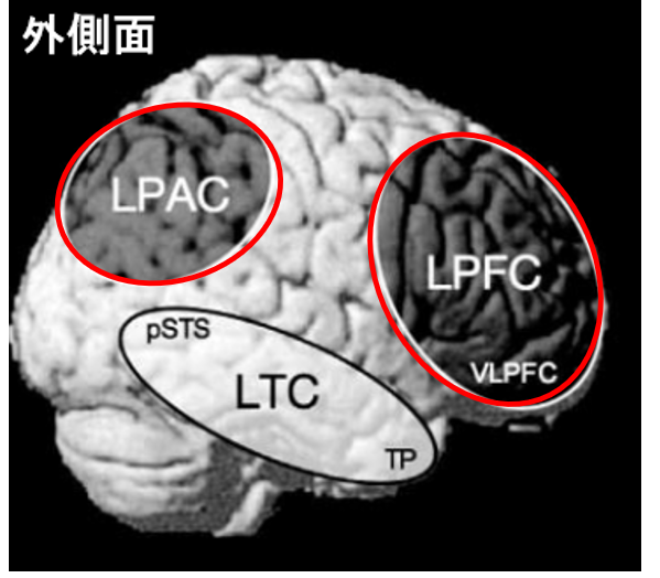 小さな子供は何でも大人のマネをしたがりますが、私達人間は生まれつき模倣に関わる脳の仕組みを持っています。これはいわば見たものを運動に変えてしまうような仕組みになり、ミラーニューロンシステムと呼ばれることもあります。ミラーニューロンシステムは様々な領域で出来ていますが、主なものには、外側前頭前野(LPFC)と外側頭頂葉(LPAC)があります。
