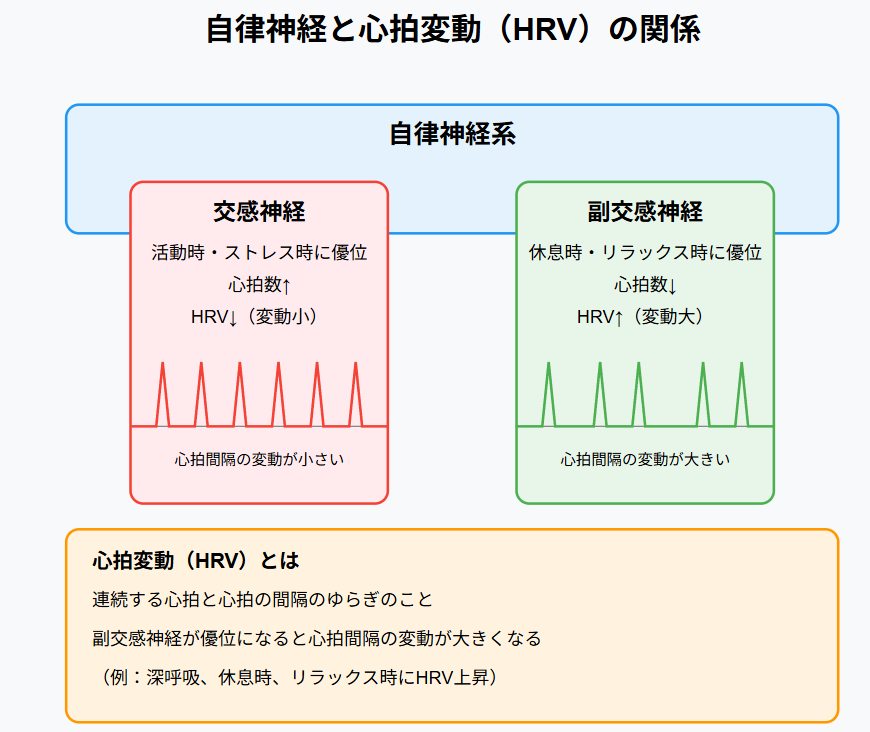 自律神経の働きを捉える指標として、心拍変動が注目されています。HRVとは、連続する心拍と心拍の間隔のゆらぎのことで、これは単なる心拍数の速さや遅さだけでは読み解けない“変動パターン”を映し出します。副交感神経が優位になると心拍間隔の変動が大きくなるため、たとえばゆったりと深呼吸しているときや休んでいるときにHRVが上昇しやすいのです。