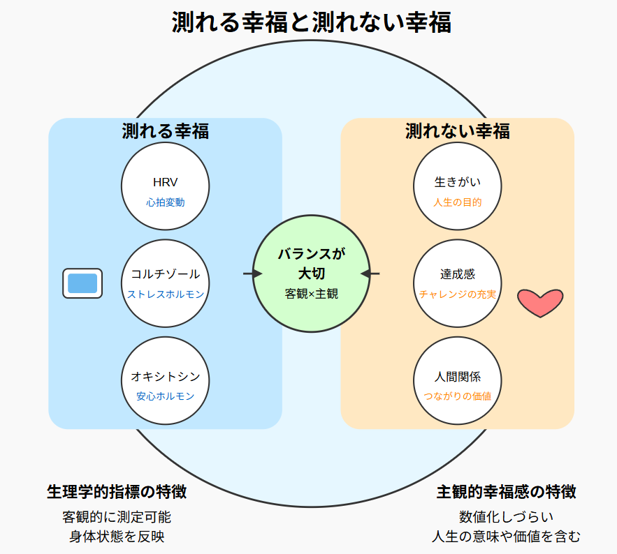 また、幸福とは単にストレスが少ないだけではなく、ときに大きなチャレンジや自己実現のプロセスを通して得られる充実感でもあります。数値上は多少ストレスが高くても、「やりがいある仕事に打ち込めている」という実感がある場合、本人はむしろ幸せと感じるかもしれません。つまり、生理指標は幸福の一つの側面(安心感や落ち着き、ポジティブな覚醒など)を示してくれますが、それが“すべて”を語るわけではないのです。