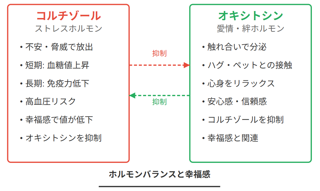 オキシトシンは「愛情ホルモン」「絆ホルモン」とも呼ばれ、家族や友人、恋人、あるいは動物と触れ合うときに分泌が促されるといわれています(Schneiderら, 2023)。人とハグしたり、ペットを抱きしめたり、あるいはマッサージを受けてリラックスするとき、私たちの体内ではこのホルモンが増え、心身を和らげる方向へ働きかけると考えられます。