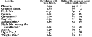 先行研究が抱えていた問題点を修正する形で、知覚における弁別能力(視覚、聴覚(ピッチ)、重量)や知能(古典、フランス語、国語(英語)、数学、一般常識、音楽)などの相関係数を求め、知能がどのようなものかについての仮説を提示しています。