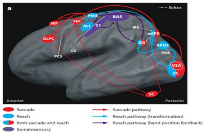 一般にリーチ動作は眼の動きと手の動きを協調させる必要があり、大脳皮質のレベルでは頭頂間溝がその役割を担っていることが知られている(図中mIPS)。