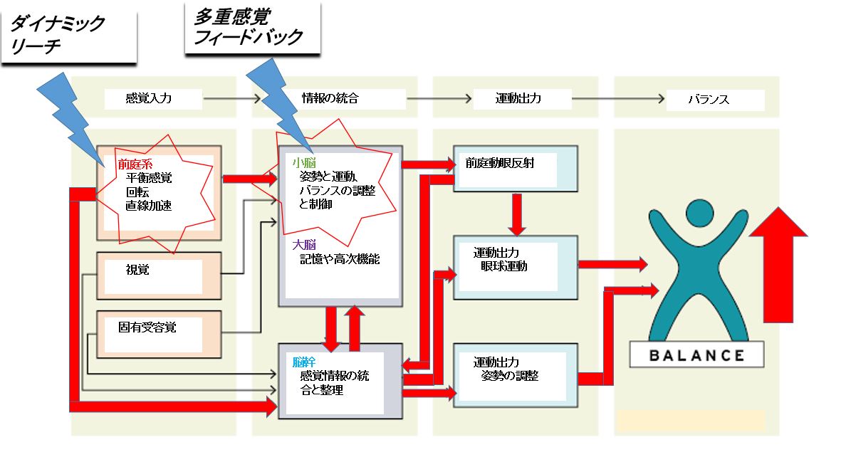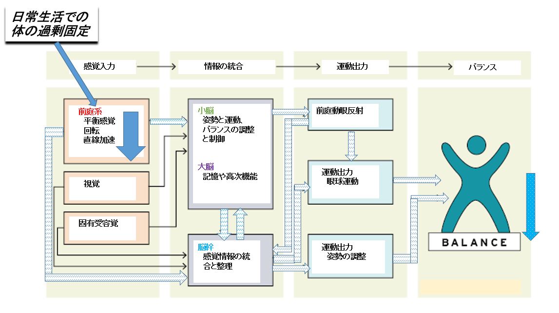 具体的には前庭系へ十分な刺激が入力されないため、小脳や脳幹、大脳への情報入力や、さらにはそこからの情報出力も少なくなり、体の揺れに合わせて眼や頸部、体幹を協調させる経路が十分に働いていない状態になる。