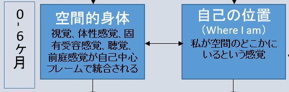 生後6ヶ月くらいまでは、足音が右の方からやってくる、左の方に乳首が見えるというように、様々な感覚が自己中心フレームでまとめられて「空間の中にいるわたし」という感覚が醸成されます。