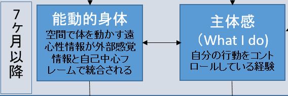 この時期には体の外から脳の中に入ってくる求心性の感覚情報だけでなく、脳から出ていく遠心性の情報が、自己中心フレームの中でまとめられていきます。