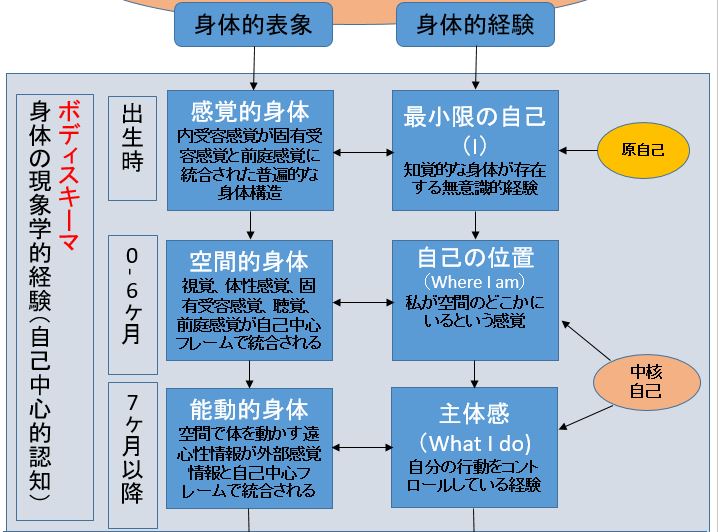 これは快や不快といった基本的な情動感覚に手足や体の曲がり具合、傾き具合が統合されてできる感覚で、この論文では「原自己」と位置づけられています。