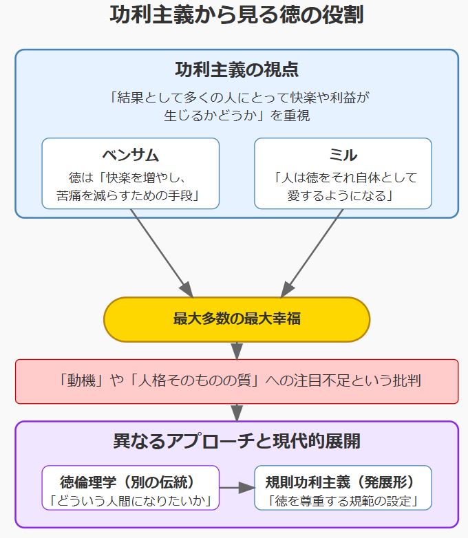 功利主義では基本的に、「結果として多くの人にとって快楽や利益が生じるかどうか」が重視されます。そのため、徳そのものを内在的に尊いものと考えるのではなく、「徳を持つ人や社会の方が、結果的に幸福が大きくなるなら、徳は大切だよね」という位置づけになるわけです。