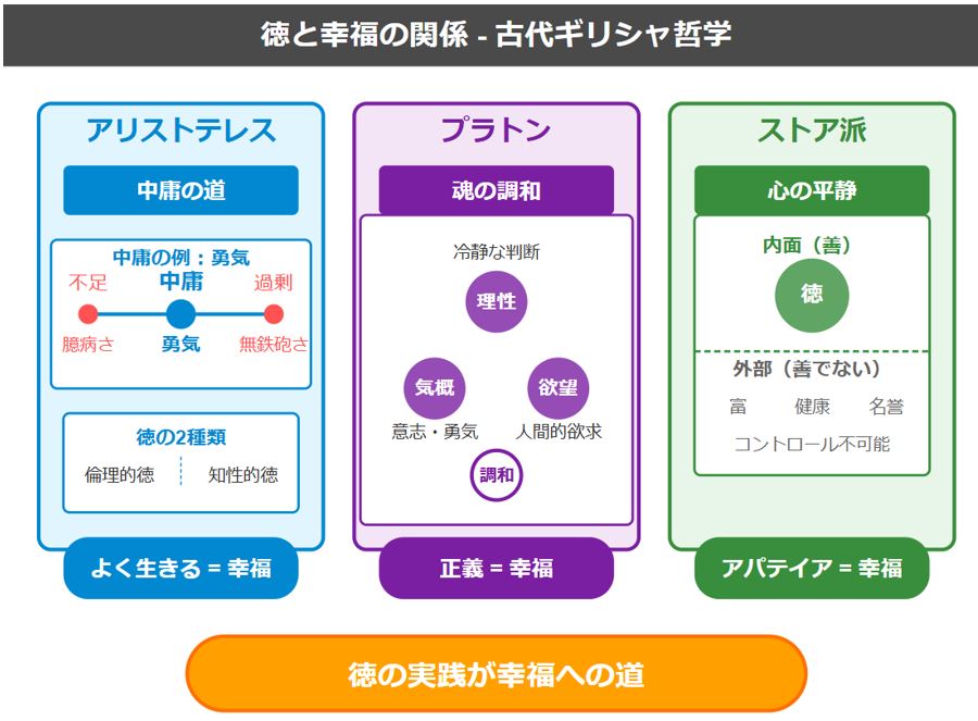 こうした多様性がある中で、古代ギリシアの哲学者たちは「幸福とはどのように生きることなのか?」を突き詰め、その結果「徳を備えた生き方が大事だ」という結論に行き着きました。彼らが言う「徳」とは、いわば人間性の優れた部分や、性格や行動の良い面を伸ばすことで身に付く心の性質のことです。